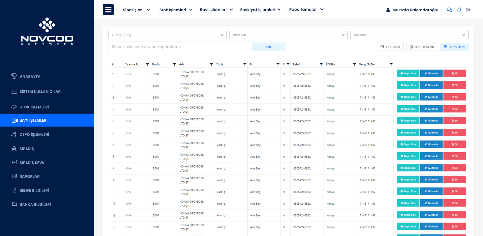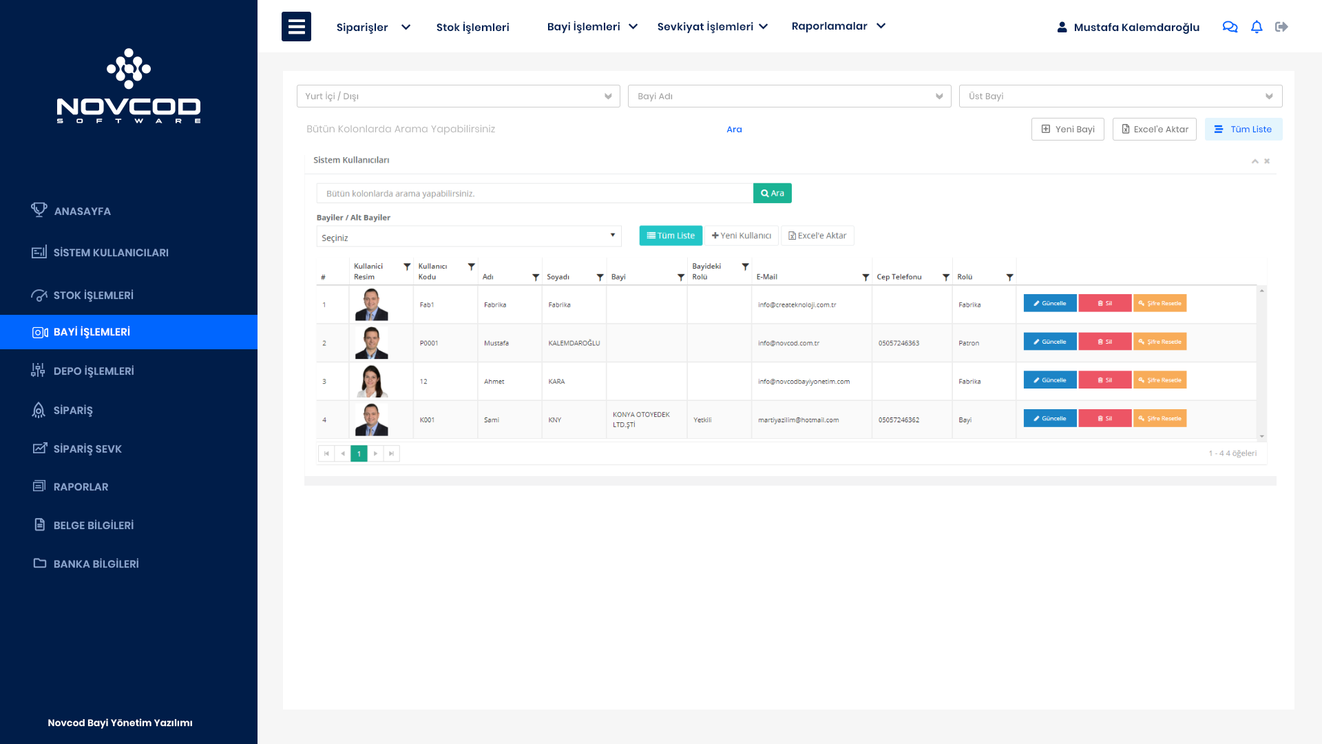 Novcod Bayi Yönetim Yazılımında Fabrika, Bayi, Alt Bayilerin kullanıcılarının tanımlandığı bölümdür. Kullanıcıya ait tüm bilgiler ve yetkiler bu bölümden girişleri yapılmaktadır.