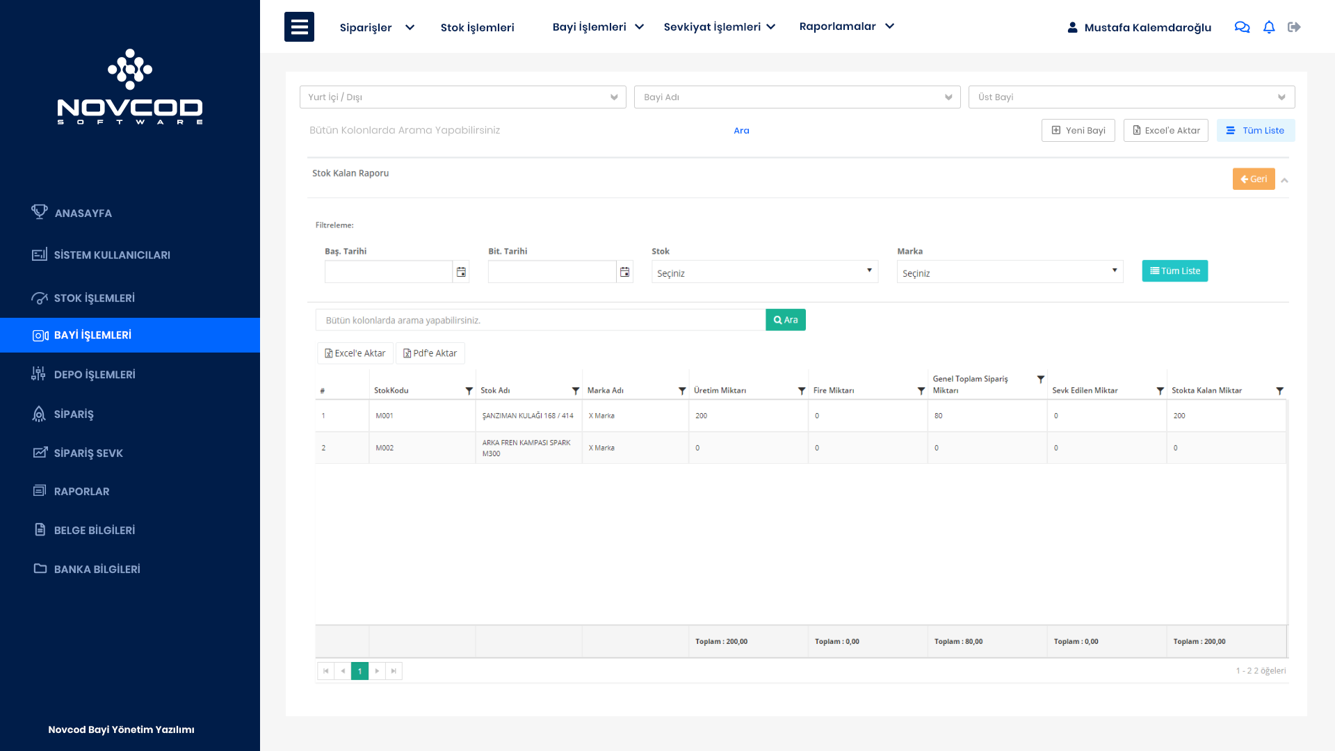 Detaylı BilgiNovcod Bayi Yönetim Yazılımında iki tarih arası filitrelemeli birden çok rapordan oluşur. Gelen Sipariş Raporları Sevk Edilen Siparişler, Tamamlanan Siparişler, İptal Edilen Siparişler, Silinen Siparişler, Günlük Üretim Raporları, Stok Raporları, Sipariş-Sevk Raporları, Bayi Raporları, Depo Raporları gibi istenilen özel raporlamalardan oluşan bölümdür.